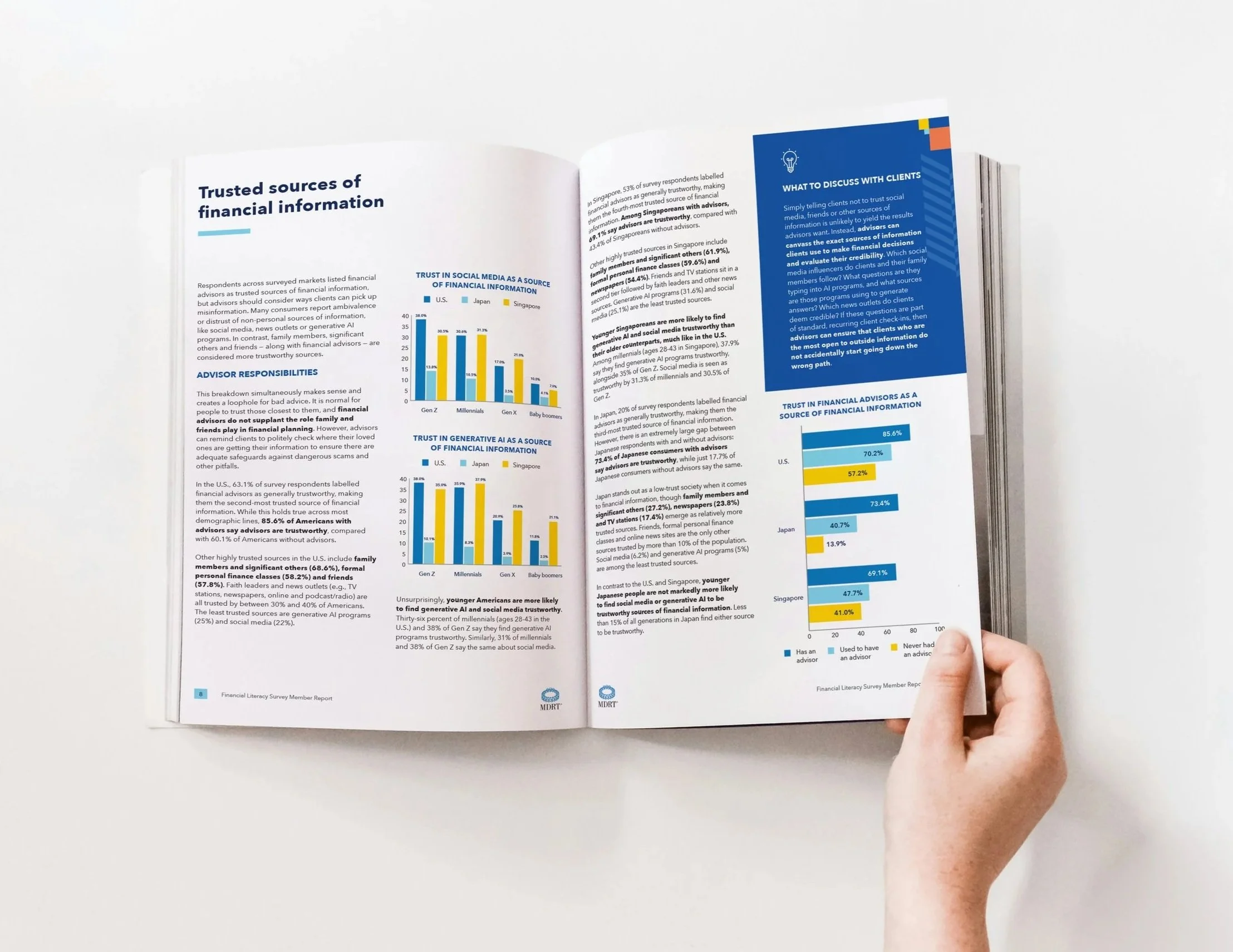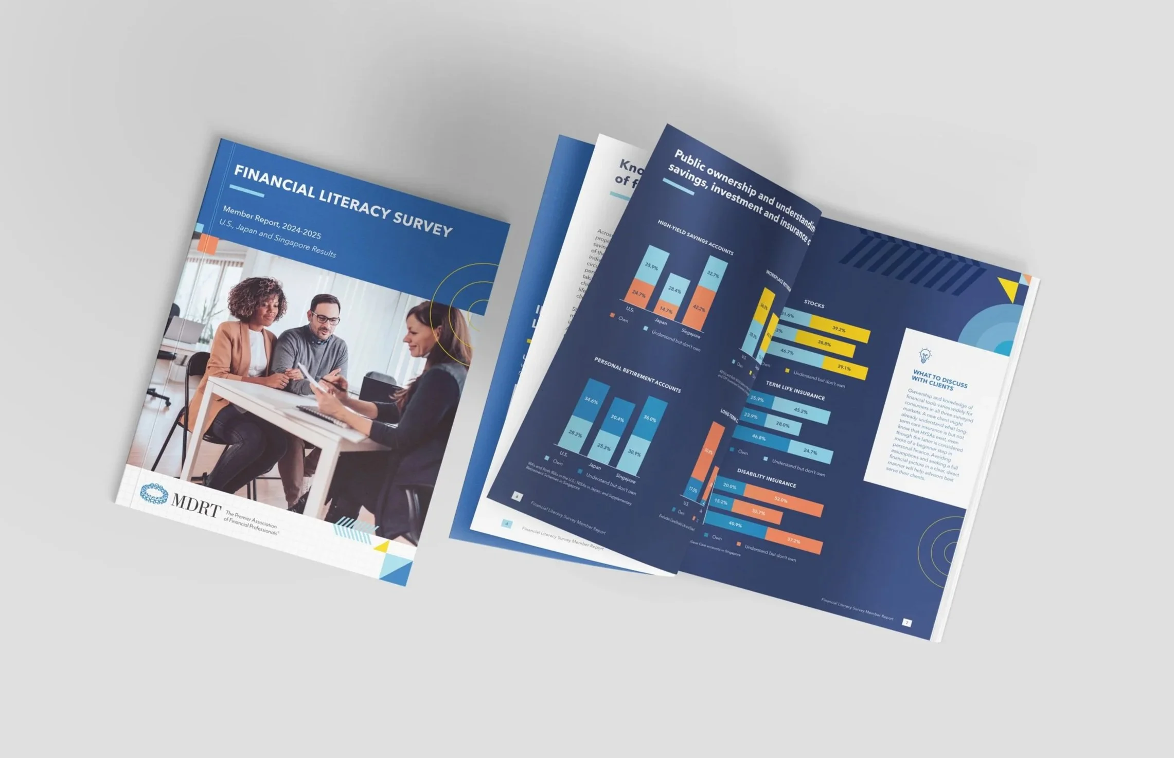 I designed a multi-page report for financial client Million Dollar Round Table (MDRT) to bring visual clarity and interest to data-heavy survey content. The goal was to organize and present the findings in a clear, digestible format for distribution to MDRT members. The final deliverable was a 12-page report featuring custom data visualizations and layouts aligned with MDRT’s brand, helping transform complex information into an engaging and accessible publication.